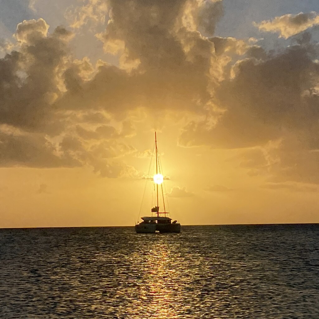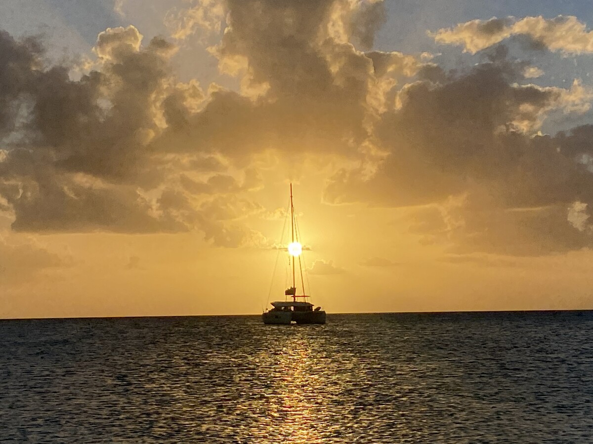 Exumas sunset view of our charter boat from a deserted island.